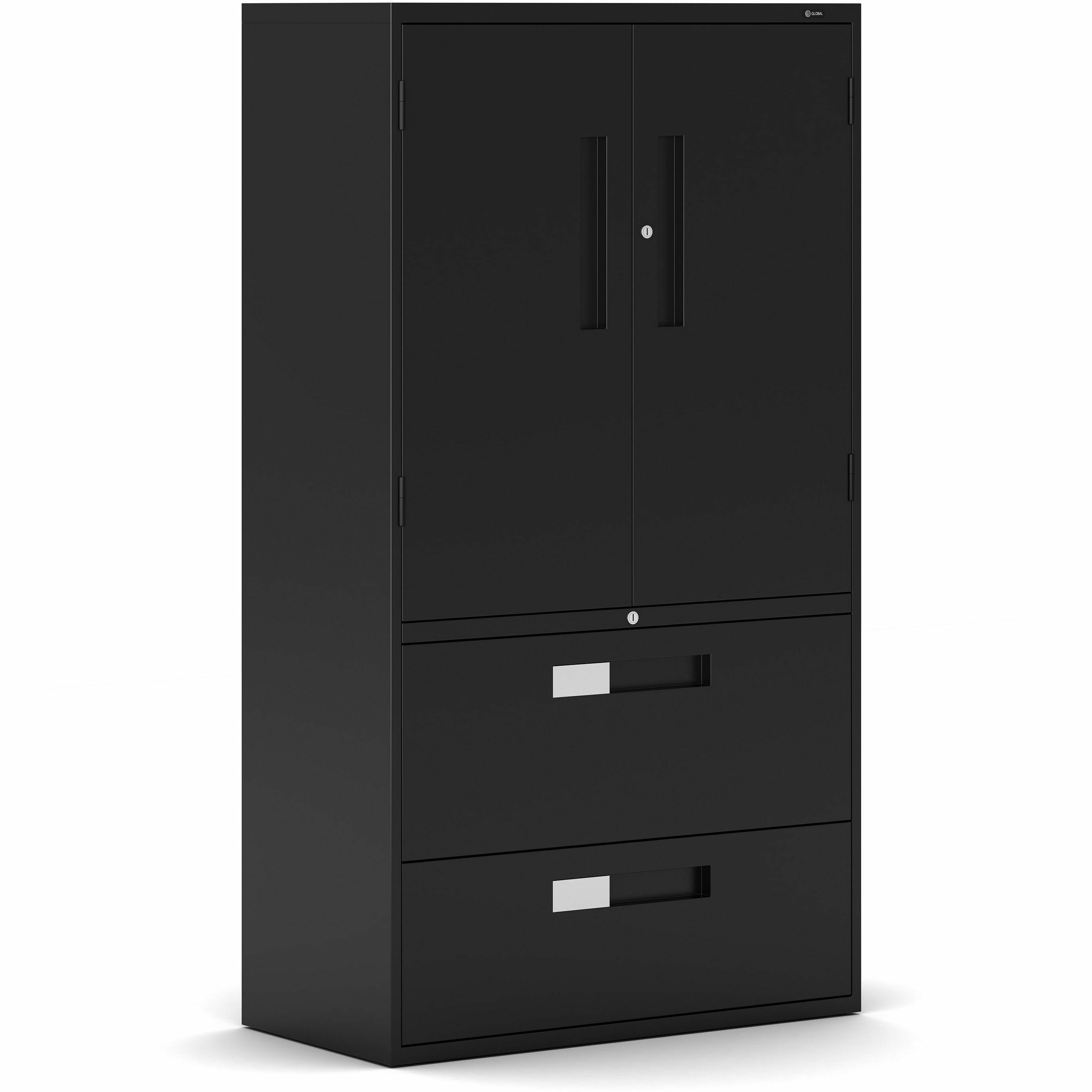 Metal multi-stor cabinet with two door storage above two lateral file drawers. Storage cabinet features three shelves; two fixed and one adjustable. Lateral files feature one "B" opening and one "L" opening to accommodate letter, legal, A4 hanging folders and EDP suspended data binders. Center pull handle design on doors and drawers, two separate locking systems in each cabinet and doors open 170°. Four adjustable leveling glides and side to side hanging file bars included. Made in Canada. Tested to meet or exceed ANSI / BIFMA standards and is compliant with the emissions guidelines set by the GREENGUARD Environmental Institute. Black finish. Overall Dimensions: 36"W x 18"D x 65.25"H. Backed by Global's Limited Lifetime Warranty.