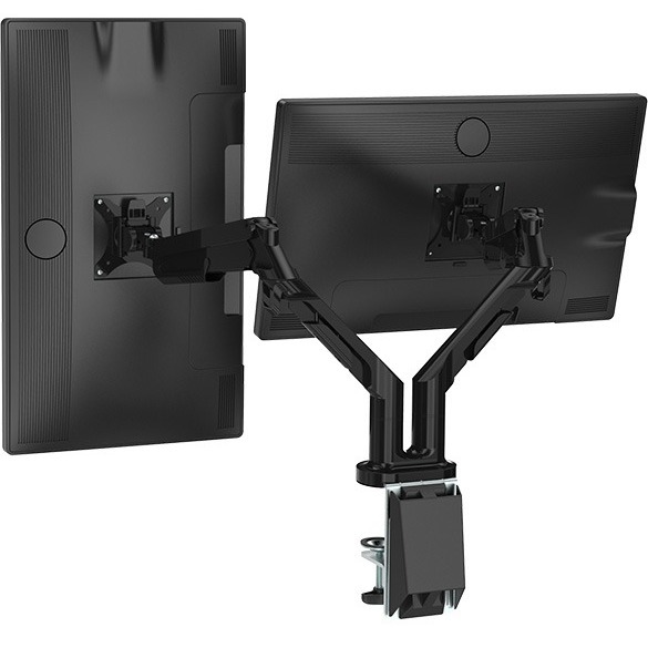 Easy to manoeuvre with finger touch height adjustment Dual Monitor Arms. VESA mount and quick release for up to 32" monitor with 24" arm extension. Desk clamp and/or grommet mount included. 14" height adjustment range, from 5"-19". 90° monitor tilt and 90° VESA rotation. 19.8 lb capacity per arm. 10-year warranty. Black.