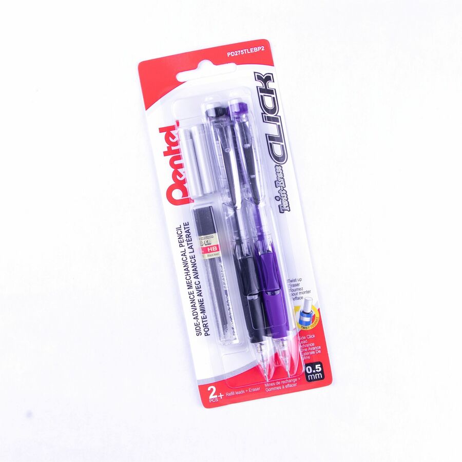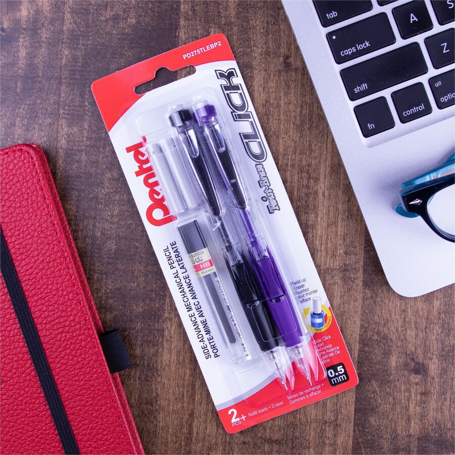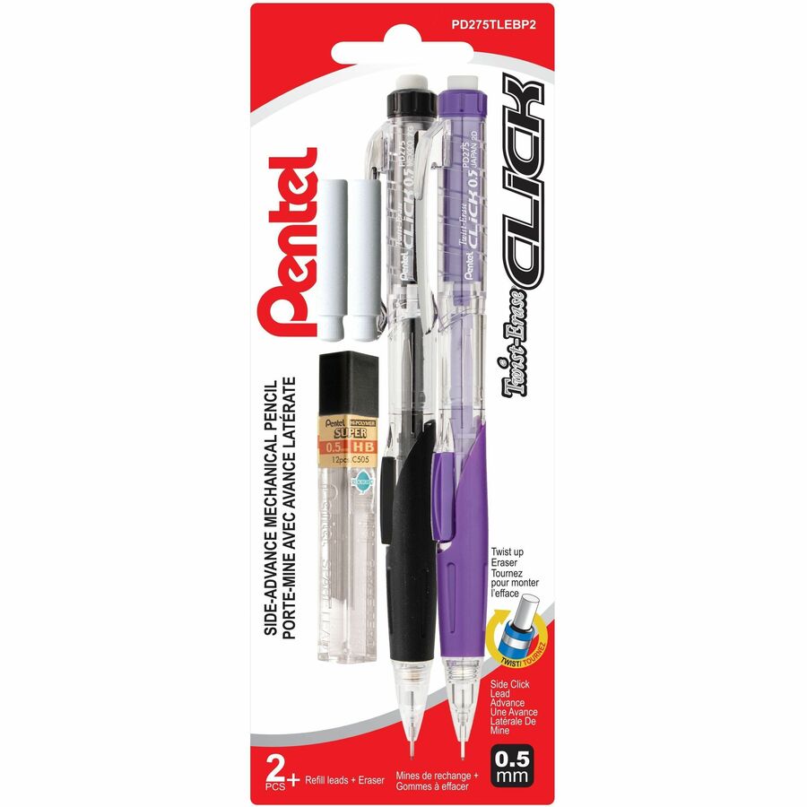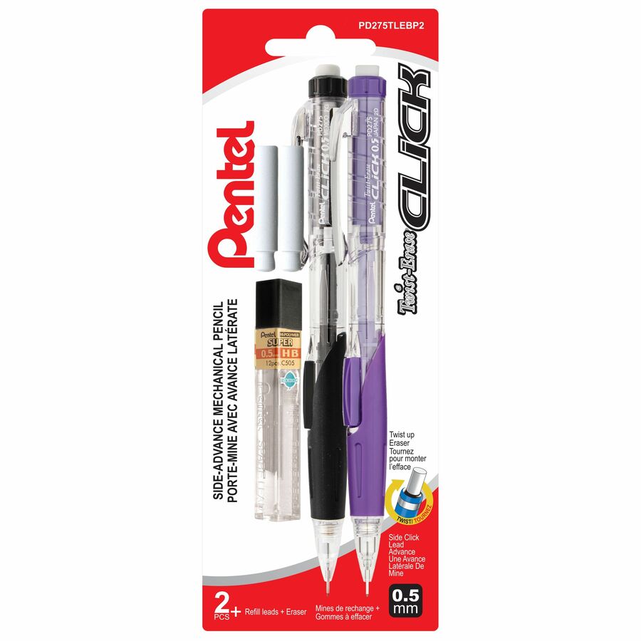 Pentel Twist-Erase Click Mechanical Pencil, (0.5mm) Clear Barrel, Assorted Grip Colours with Leads and Erasers, 2PC Pack - Mechanical Pencil with Side Click Lead Advance, Large Retractable Eraser